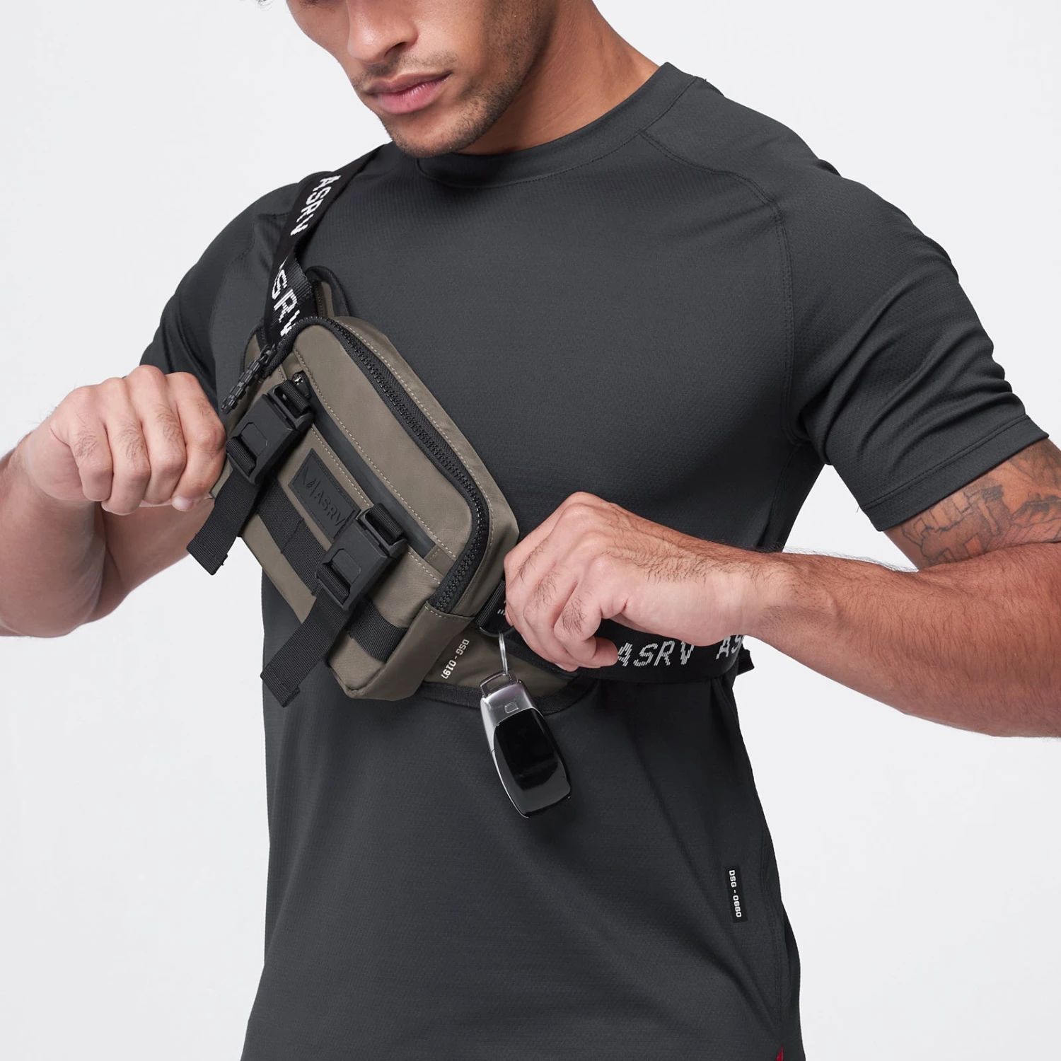 Small cross body bag with Mil-Spec nylon strap and FidlockĀ® magnetic buckle closure, featuring MOLLE-compatible webbing across the front and two buckle straps for attaching extra clothing or a water bottle. Main compartment zipper features aircraft-grade aluminum pull tab and bag front features taped zipper pocket.