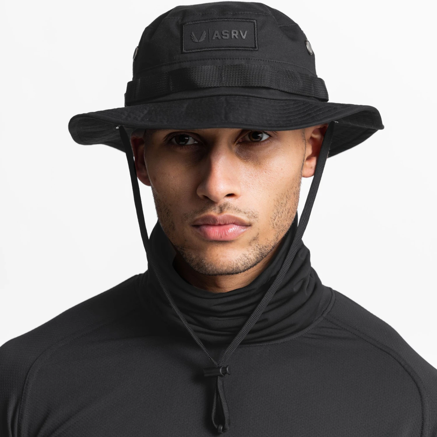 A modular boonie hat with functional upgrades and enhanced durability. All-around MOLLE-compatible webbing allows for custom attachments. Horizontal metal aglets allow for easy drawstring removal or replacement. Internal secret small items pocket offers hidden storage. Matte black metal air vents provide ventilation