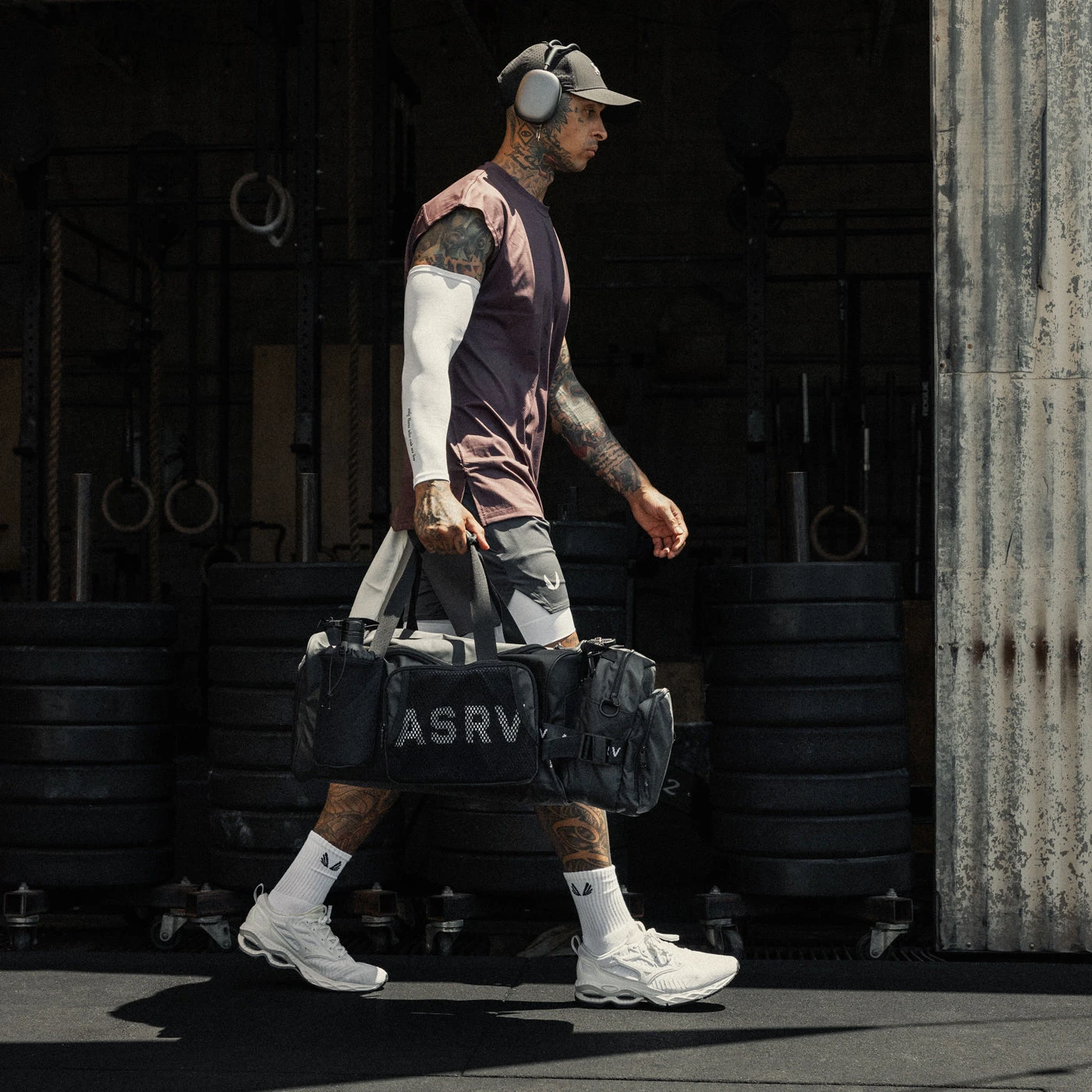 Large 50L duffle bag designed for travel with waterproof fabrication, sectioned storage, and ultra durable trims. Detachable shoulder bag uses soft-touch velcro and Fidlock® magnetic buckle for easy removal. External zip pockets, padded iPad slot, neoprene water bottle slot, and thick webbing strap offer additional storage. Left side features shoe compartment with anti-odor strip. Shoulder strap easily transfers from duffle to shoulder bag. Complete with custom grenade zipper pulls.