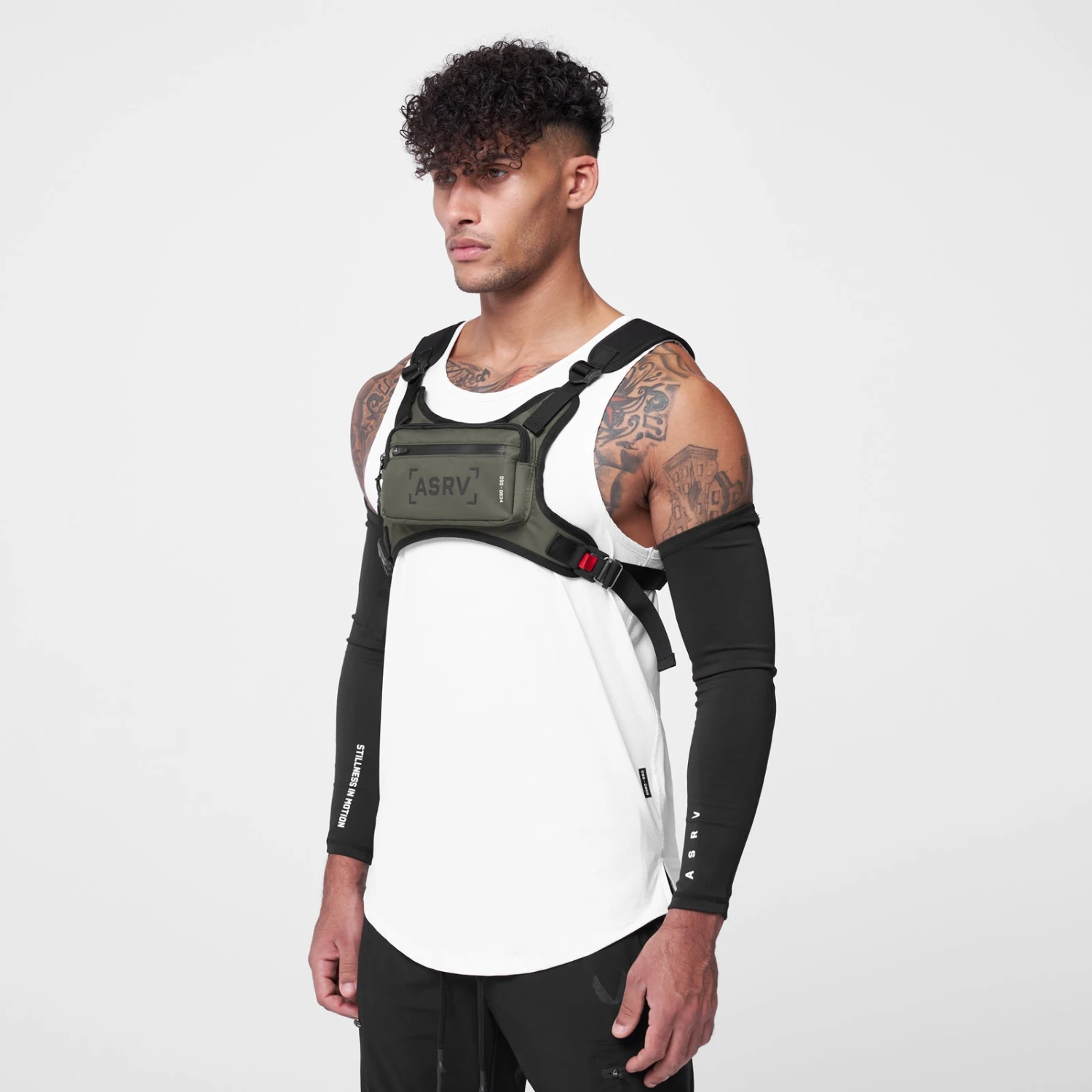 Minimalist chest pack to store your essentials while conditioning. Designed with neoprene padding on all contact points to be comfortable without a shirt. The back panel features a slim zipper pocket for extra storage and reflective print for high visibility at night.