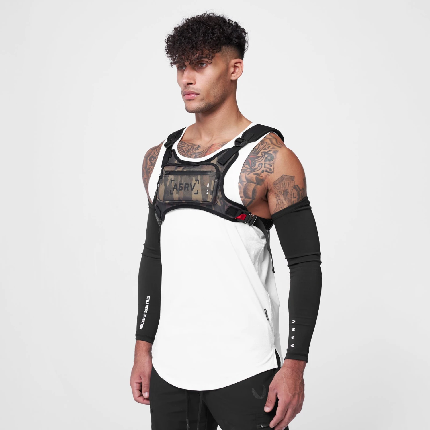 Minimalist chest pack to store your essentials while conditioning. Designed with neoprene padding on all contact points to be comfortable without a shirt. The back panel features a slim zipper pocket for extra storage and reflective print for high visibility at night.