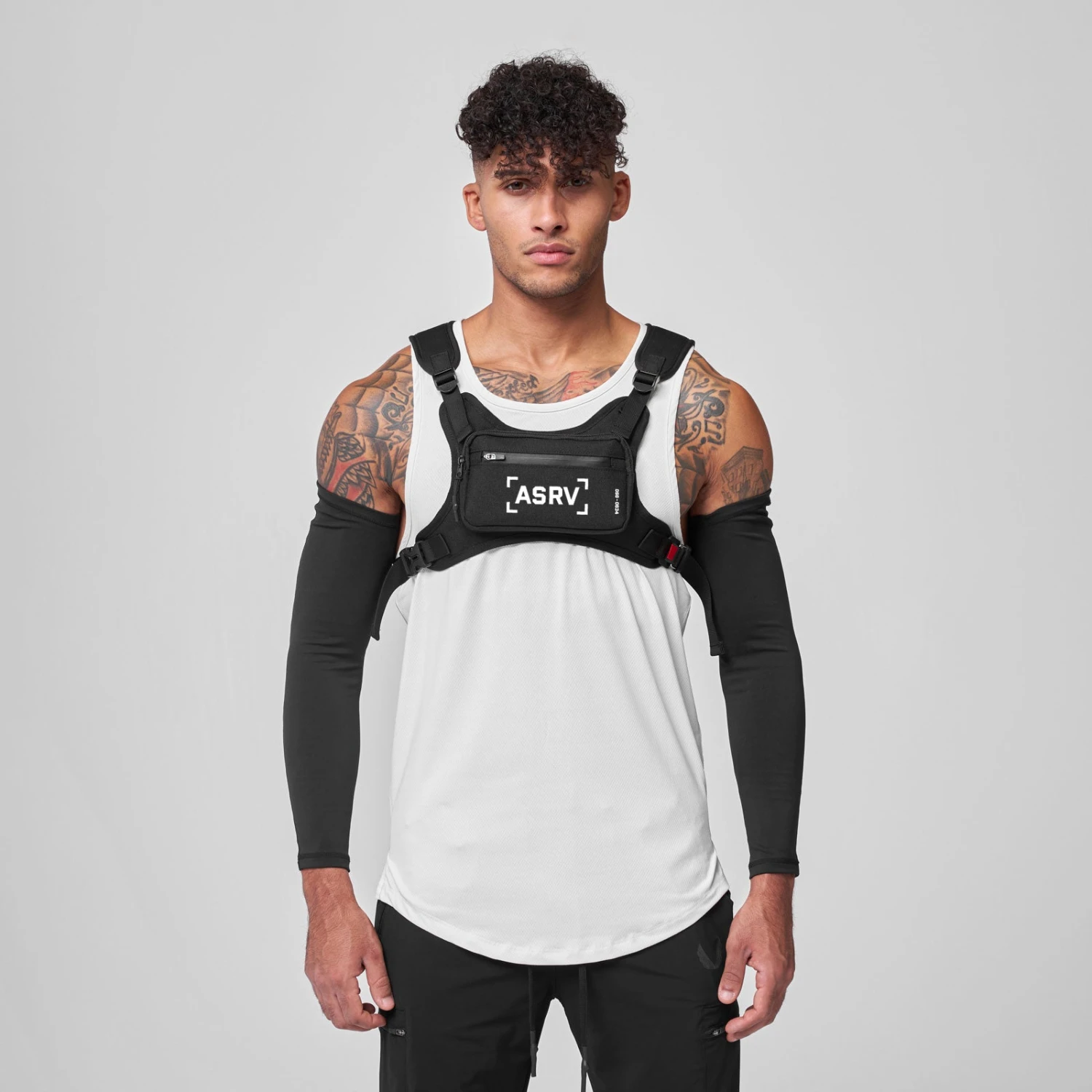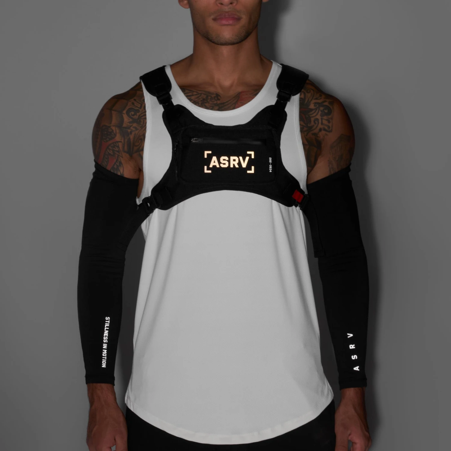 Minimalist chest pack to store your essentials while conditioning. Designed with neoprene padding on all contact points to be comfortable without a shirt. The back panel features a slim zipper pocket for extra storage and reflective print for high visibility at night.