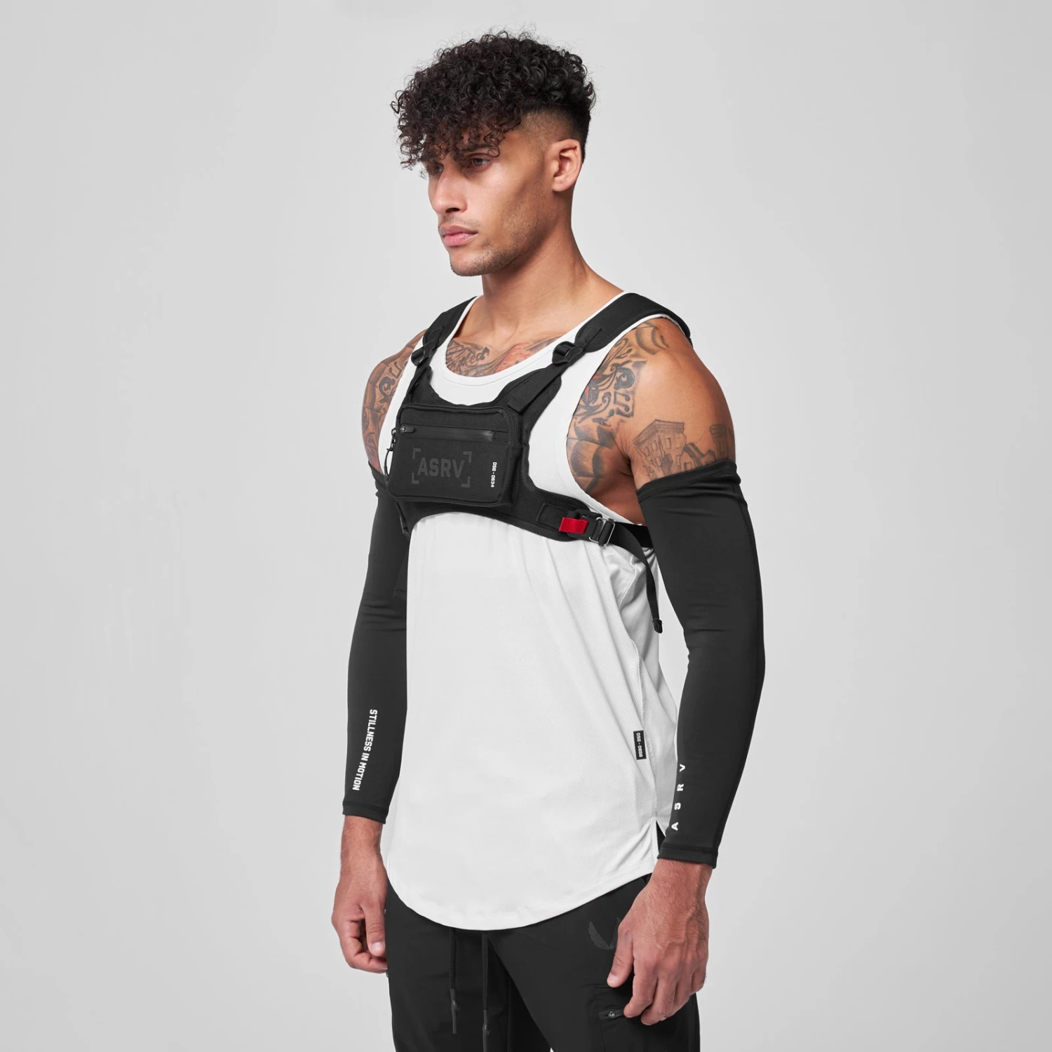 Minimalist chest pack to store your essentials while conditioning. Designed with neoprene padding on all contact points to be comfortable without a shirt. The back panel features a slim zipper pocket for extra storage and reflective print for high visibility at night.