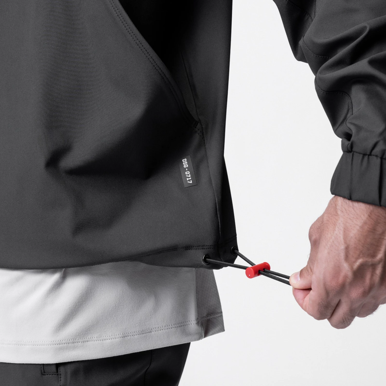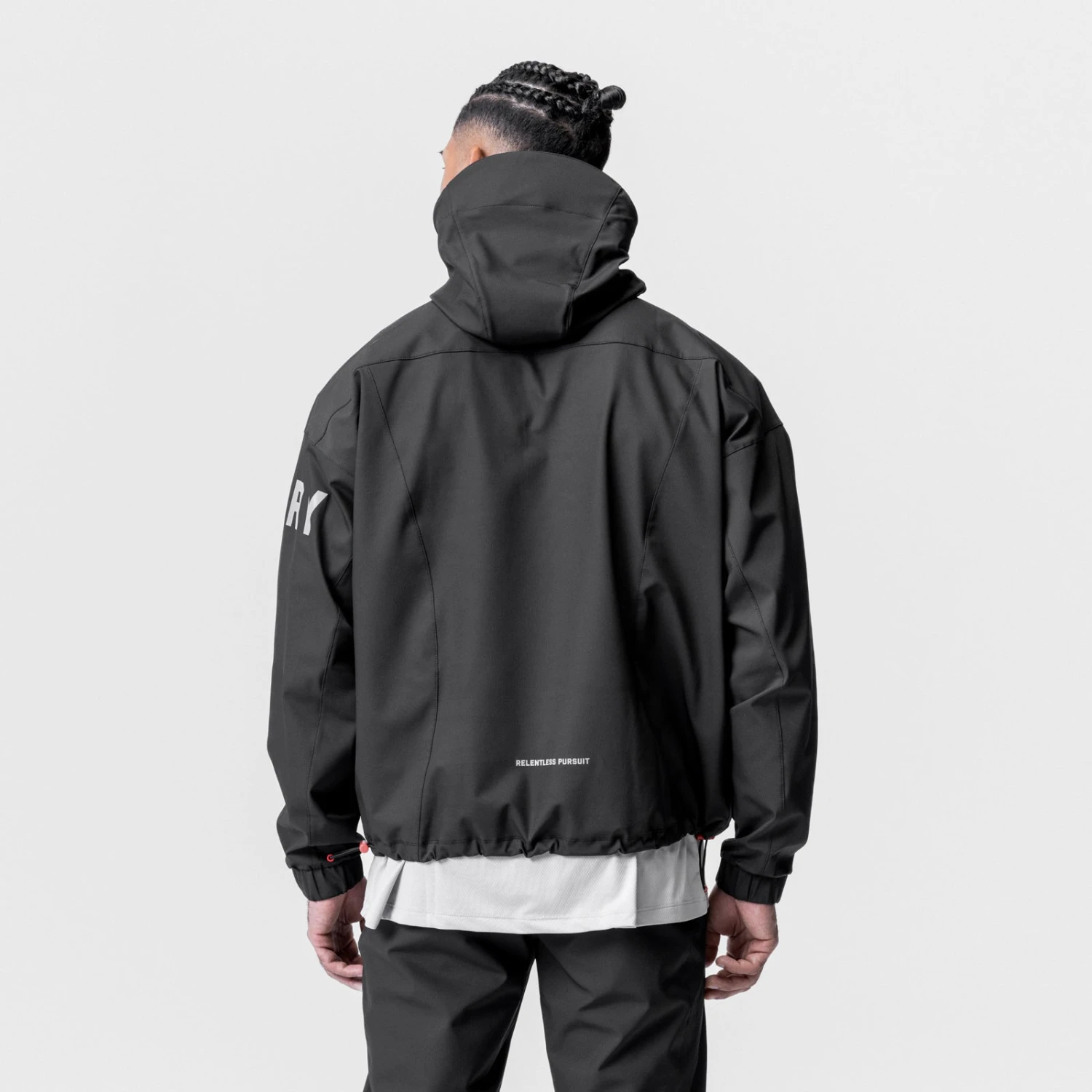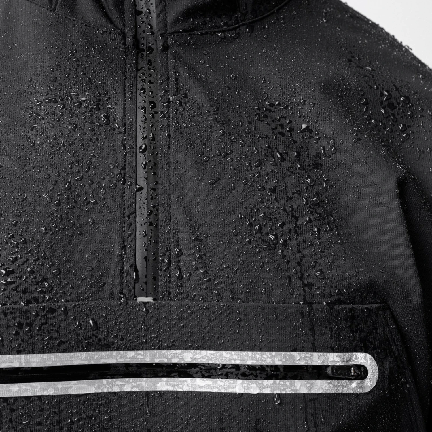 Anorak style jacket constructed from a water-resistant stretch material for transitional climates. Reflective horizontal drop pocket provides secure storage. Bottom hem features double-sided red cord locks for an adjustable fit. Hood cinch creates a secure fit for unobstructed vision. Channeled elastic sleeve cuffs. Finished with reflective arm logo and back branding for high-vis at night.