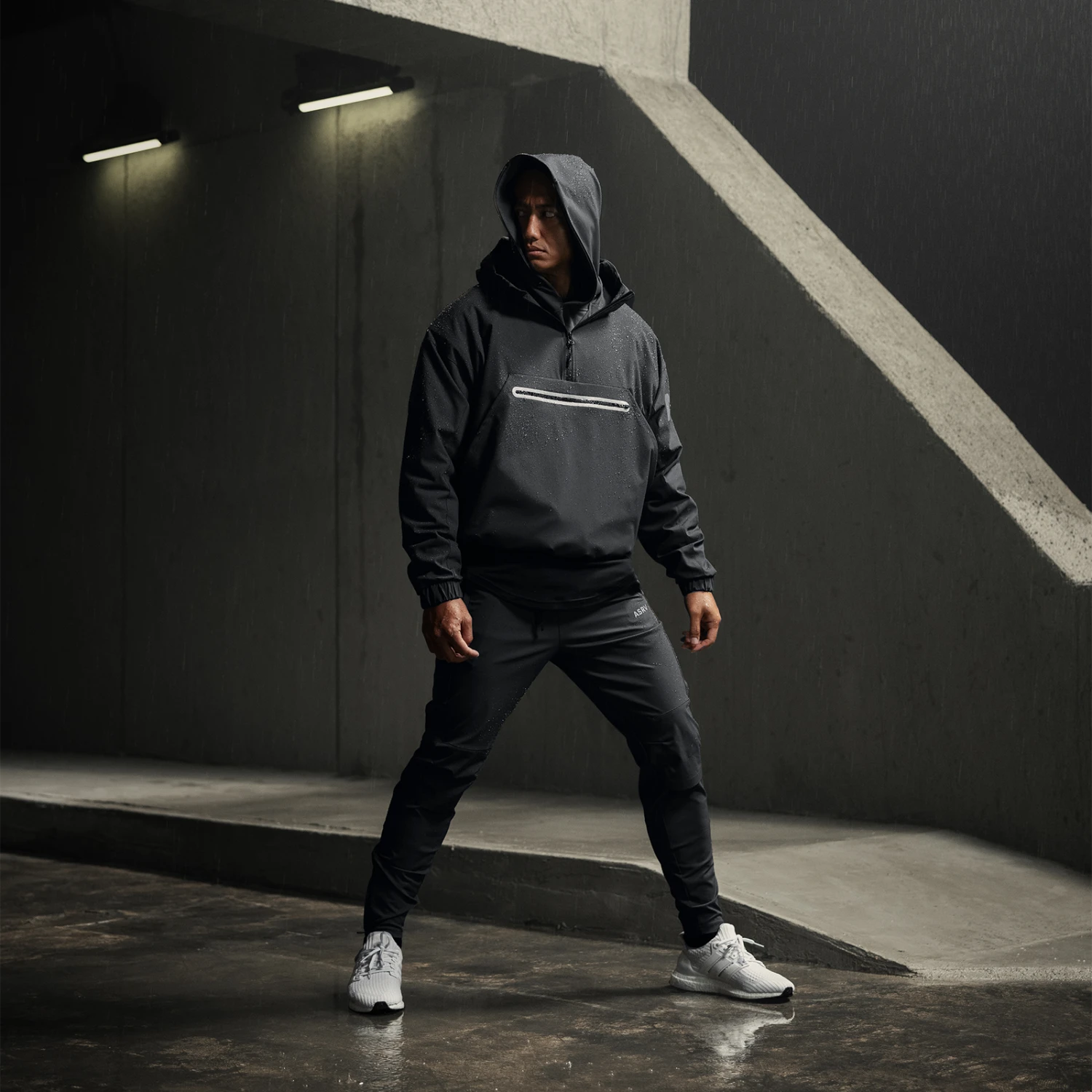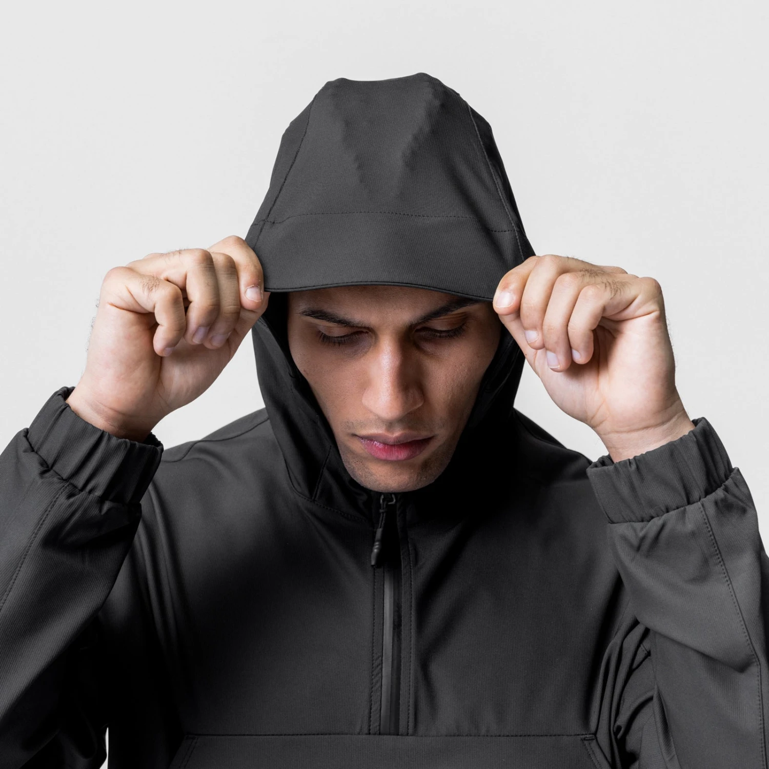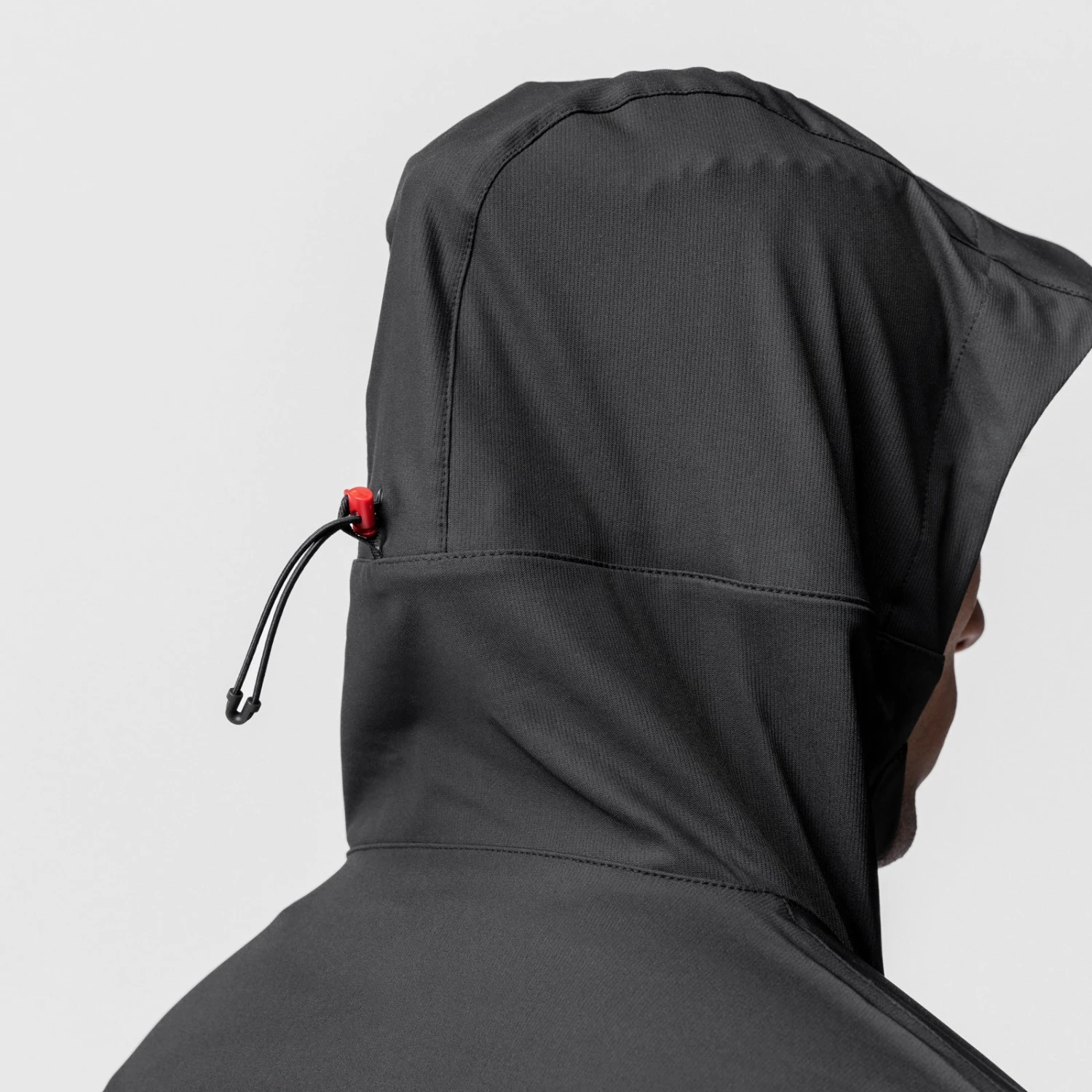 Anorak style jacket constructed from a water-resistant stretch material for transitional climates. Reflective horizontal drop pocket provides secure storage. Bottom hem features double-sided red cord locks for an adjustable fit. Hood cinch creates a secure fit for unobstructed vision. Channeled elastic sleeve cuffs. Finished with reflective arm logo and back branding for high-vis at night.