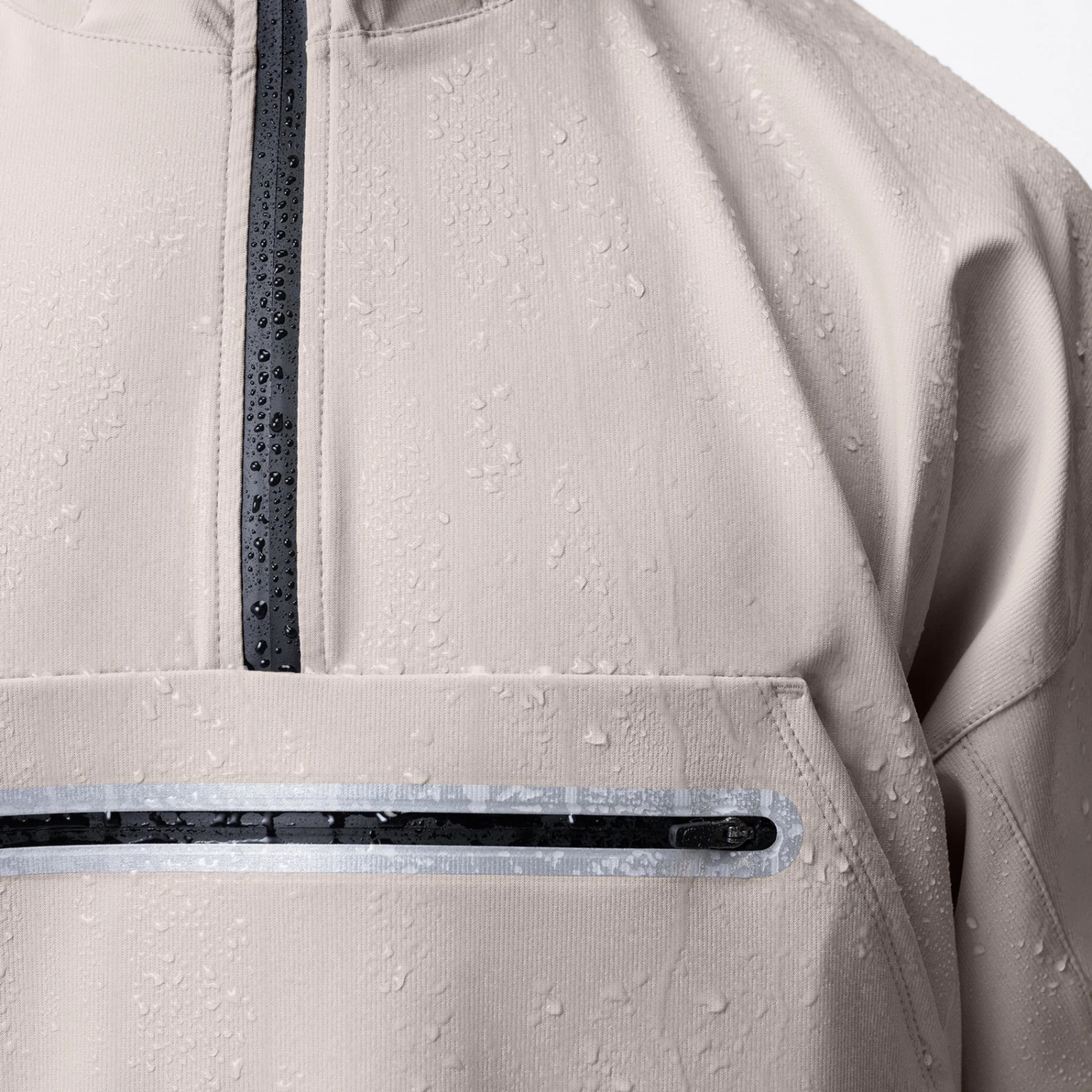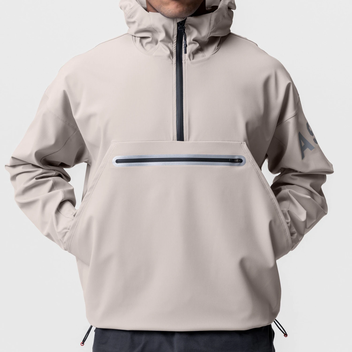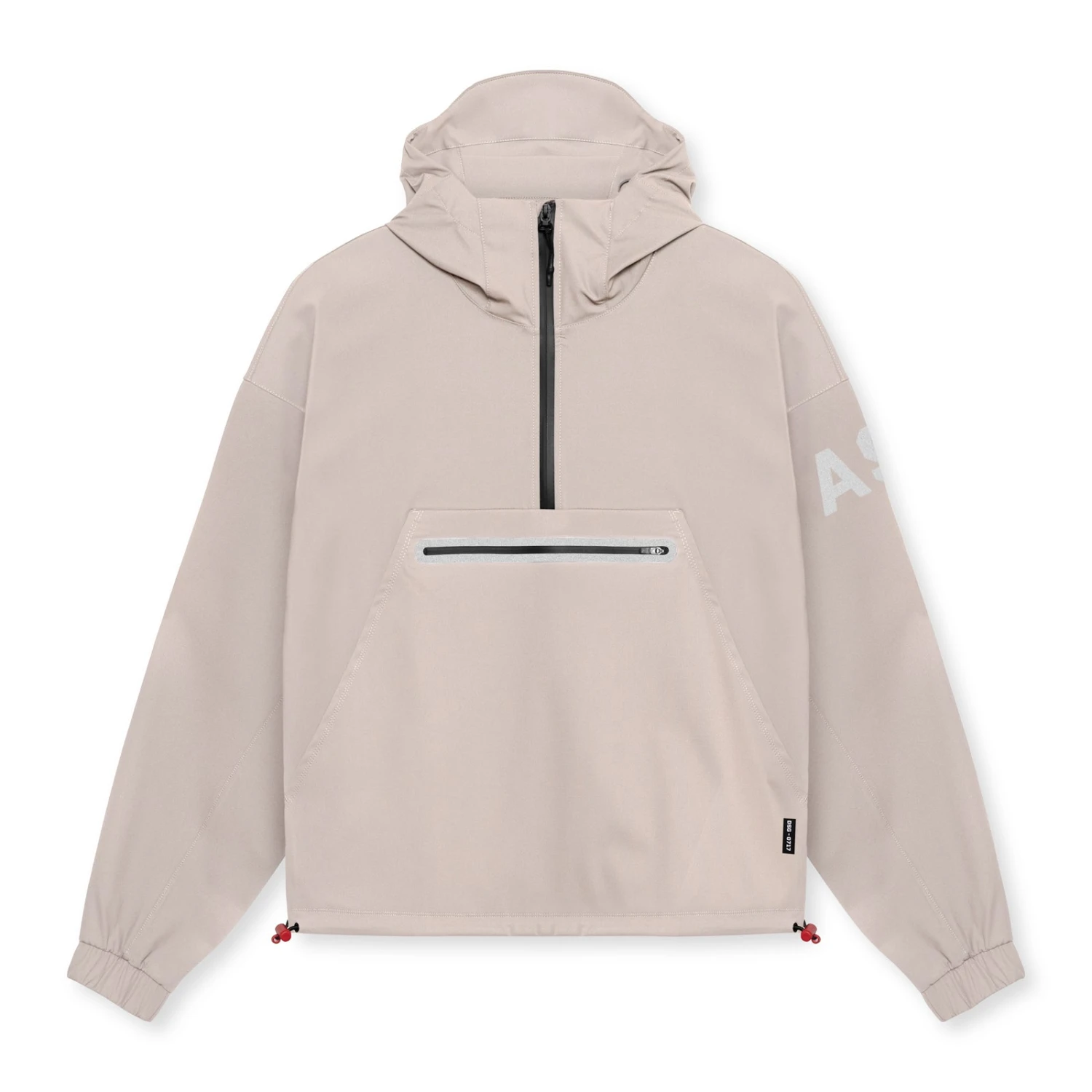 Anorak style jacket constructed from a water-resistant stretch material for transitional climates. Reflective horizontal drop pocket provides secure storage. Bottom hem features double-sided red cord locks for an adjustable fit. Hood cinch creates a secure fit for unobstructed vision. Channeled elastic sleeve cuffs. Finished with reflective arm logo and back branding for high-vis at night.