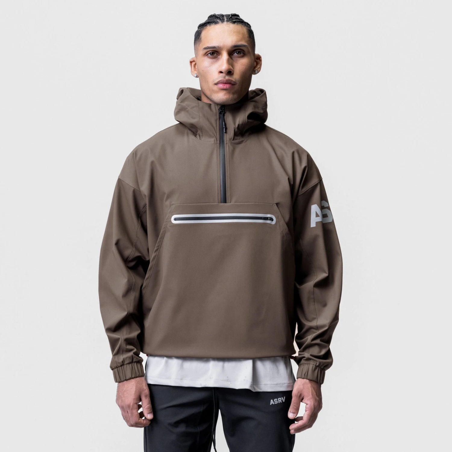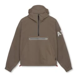 Anorak style jacket constructed from a water-resistant stretch material for transitional climates. Reflective horizontal drop pocket provides secure storage. Bottom hem features double-sided red cord locks for an adjustable fit. Hood cinch creates a secure fit for unobstructed vision. Channeled elastic sleeve cuffs. Finished with reflective arm logo and back branding for high-vis at night.