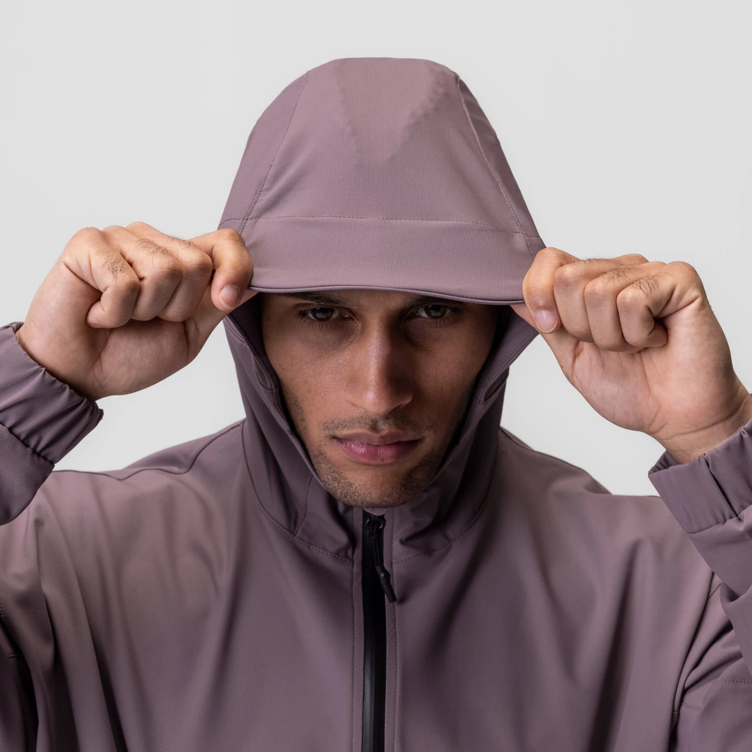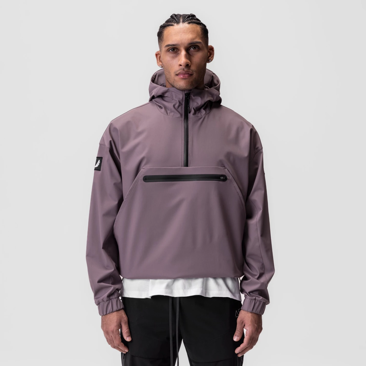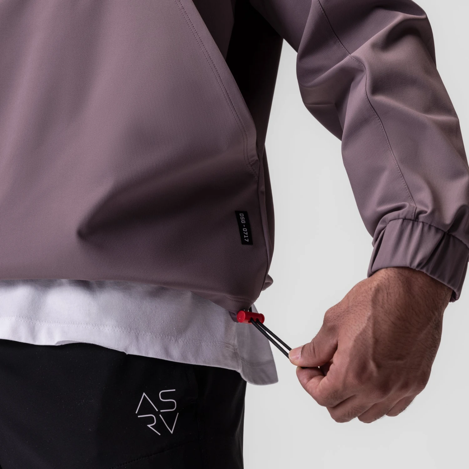 Anorak style jacket constructed from a water-resistant stretch material for transitional climates. Reflective horizontal drop pocket provides secure storage. Bottom hem features double-sided red cord locks for an adjustable fit. Hood cinch creates a secure fit for unobstructed vision. Channeled elastic sleeve cuffs. Finished with inlaid patch logos on both arms.