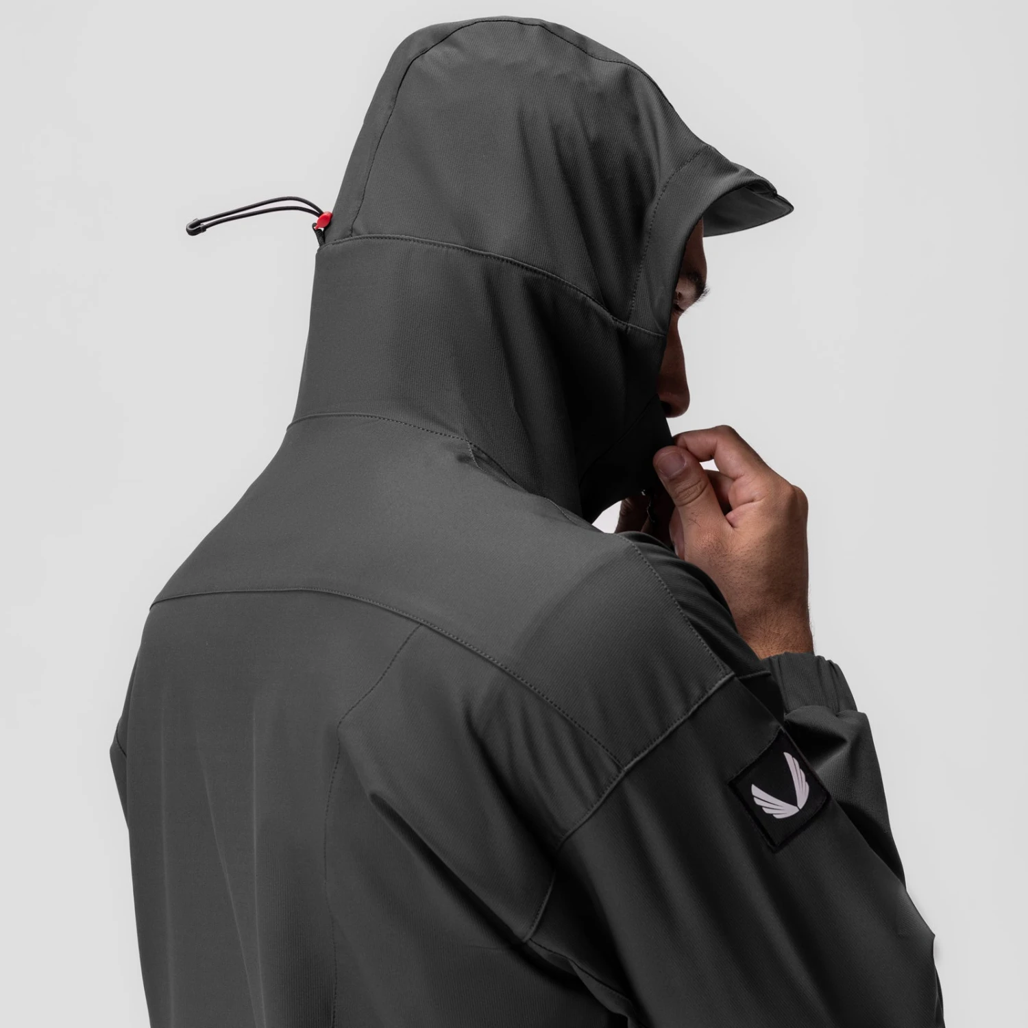 Anorak style jacket constructed from a water-resistant stretch material for transitional climates. Reflective horizontal drop pocket provides secure storage. Bottom hem features double-sided red cord locks for an adjustable fit. Hood cinch creates a secure fit for unobstructed vision. Channeled elastic sleeve cuffs. Finished with inlaid patch logos on both arms.