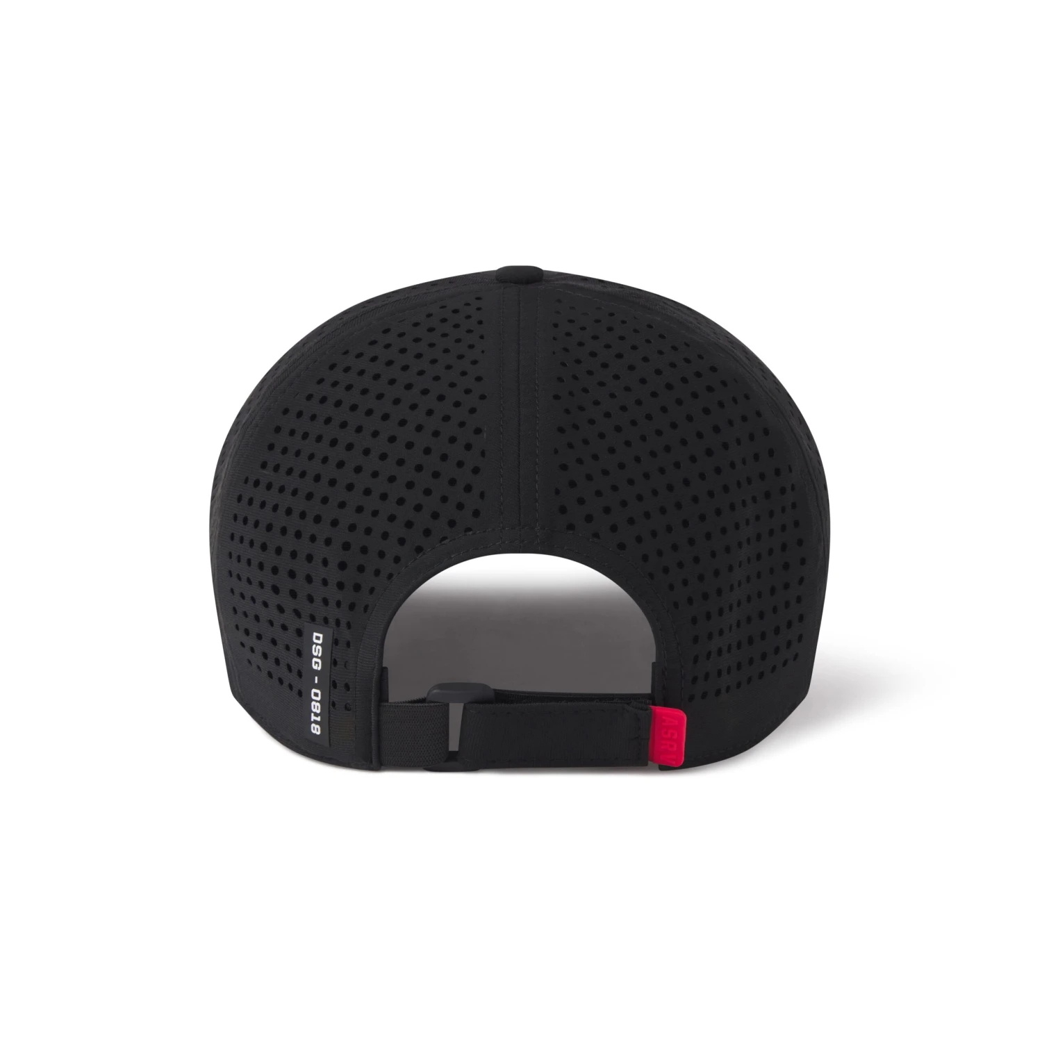 Sport cap with a structured bill constructed from Tetra-Lite™ with laser-perforated panels for breathability. Featuring a custom red embossed rubber tab. Internal Jade Thermocool sweatband provides thermoregulation and sweat control around the head. Custom “only those who risk are free” internal tape. Secured with a soft-touch strap holder. Finished with reflective branding.