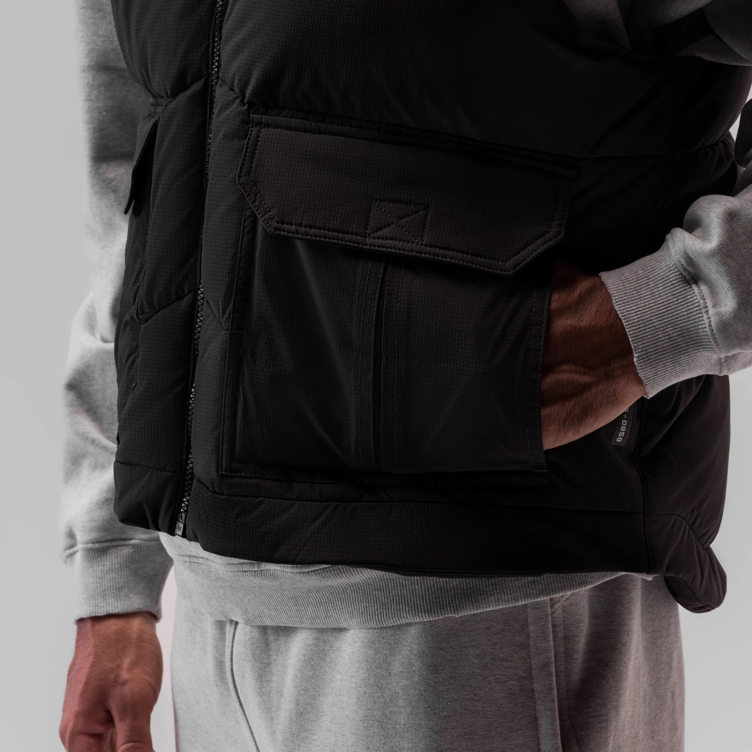 Weather-ready puffer gilet made from our durable technical ripstop material with a water-resistant treatment. Insulated with DIVO High-Fill Duck Down with a smooth lining. Featuring two front cargo pockets with hand openings on the backside. Black reflective back panel and white reflective branding provide high-vis function at night. Complete with a locker loop for easy hanging.
