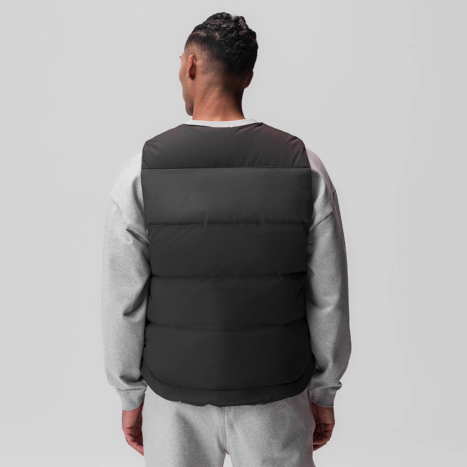 Weather-ready puffer gilet made from our durable technical ripstop material with a water-resistant treatment. Insulated with DIVO High-Fill Duck Down with a smooth lining. Featuring two front cargo pockets with hand openings on the backside. Black reflective back panel and white reflective branding provide high-vis function at night. Complete with a locker loop for easy hanging.