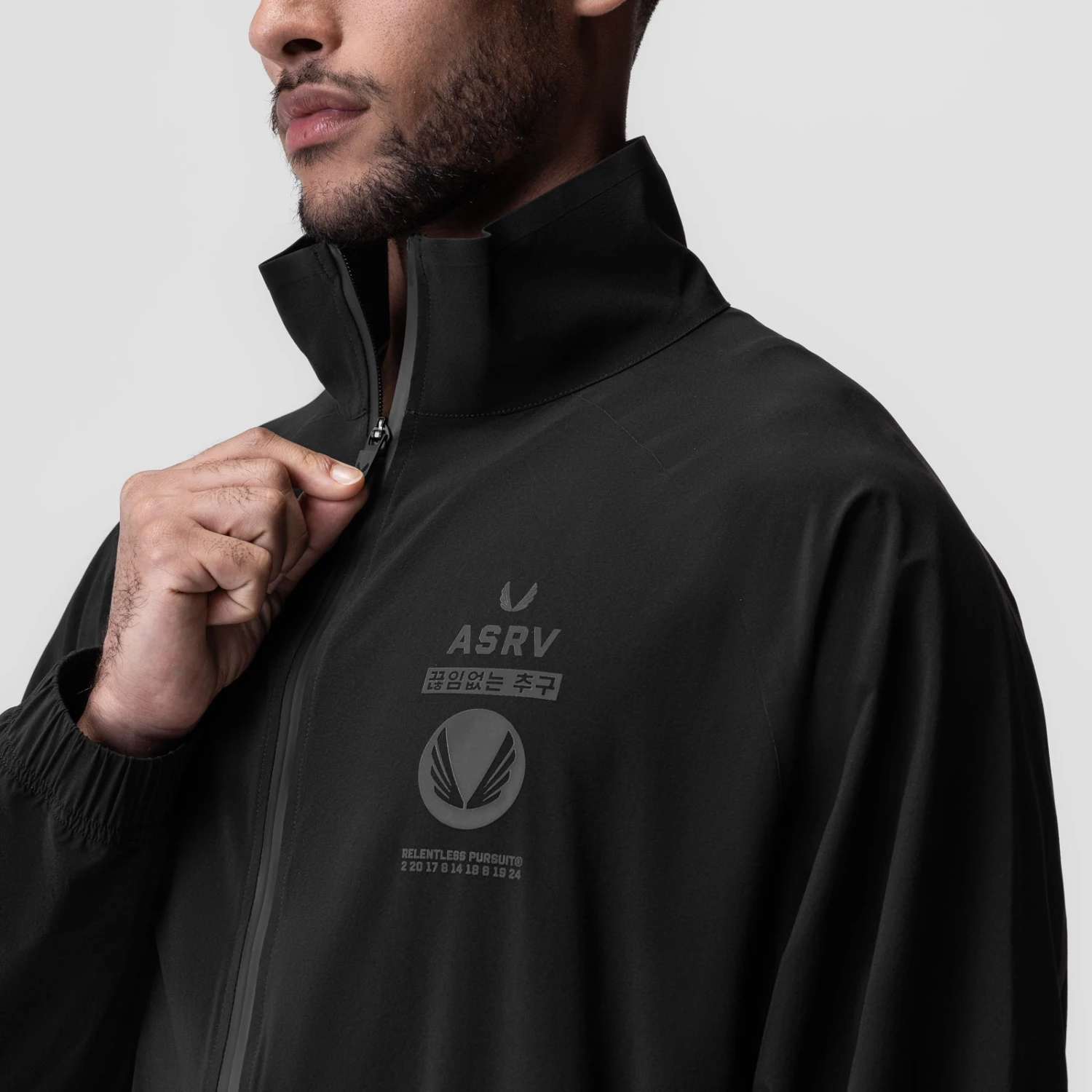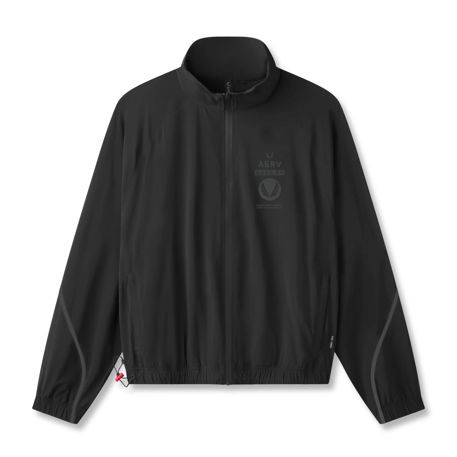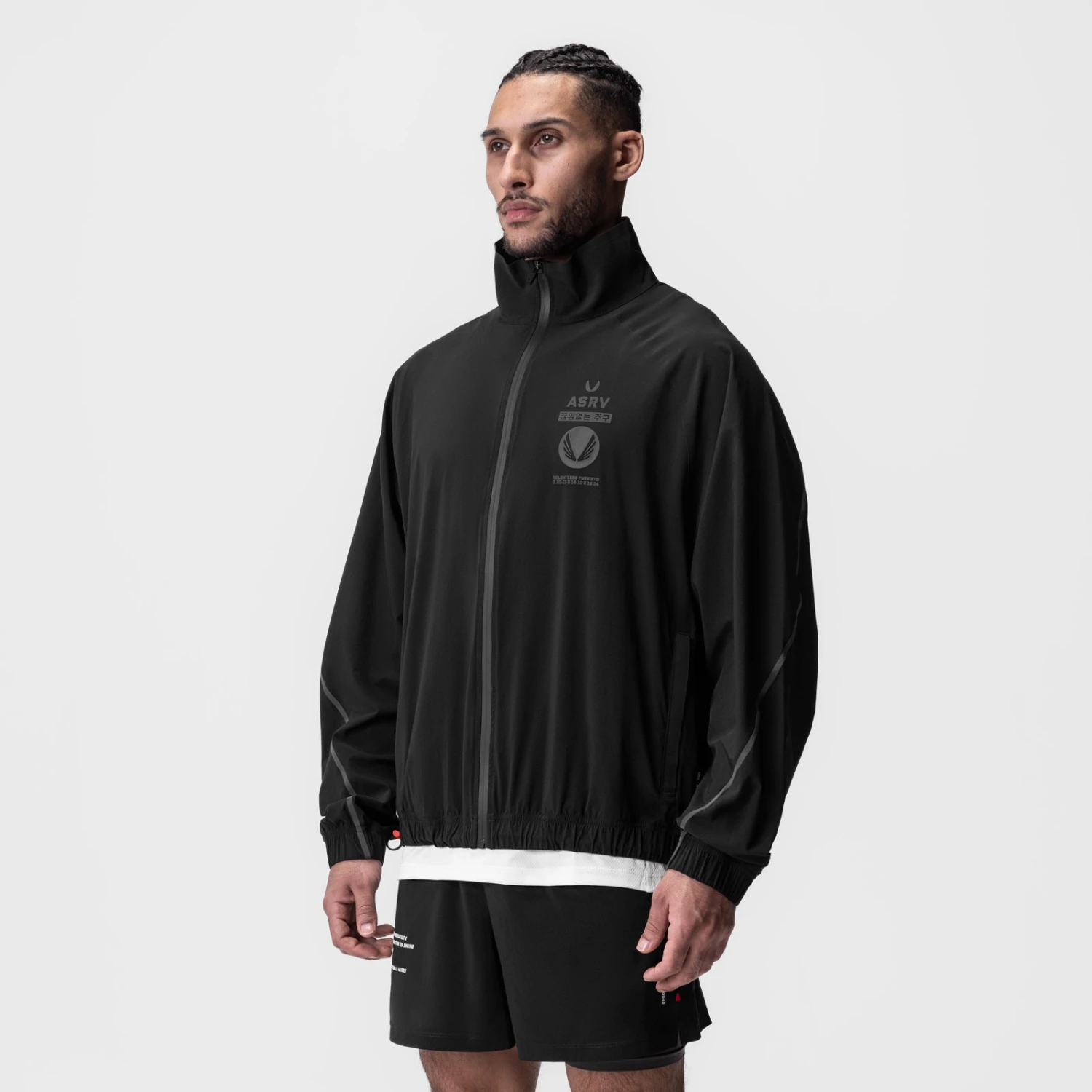 Oversized, lightweight track jacket in a vintage aesthetic. Our new Aerotex™ material is an extremely lightweight and breathable soft shell with a textured surface for enhanced drying. The jacket is constructed with bonded seams, two zippered hand pockets, adjustable cinch hem, locker loop, and reflective detailing throughout.