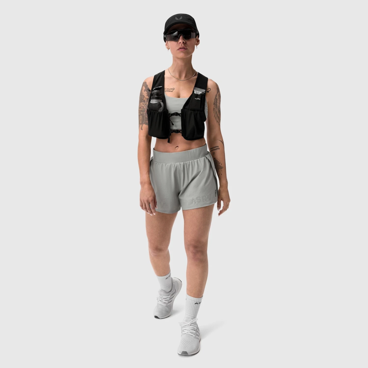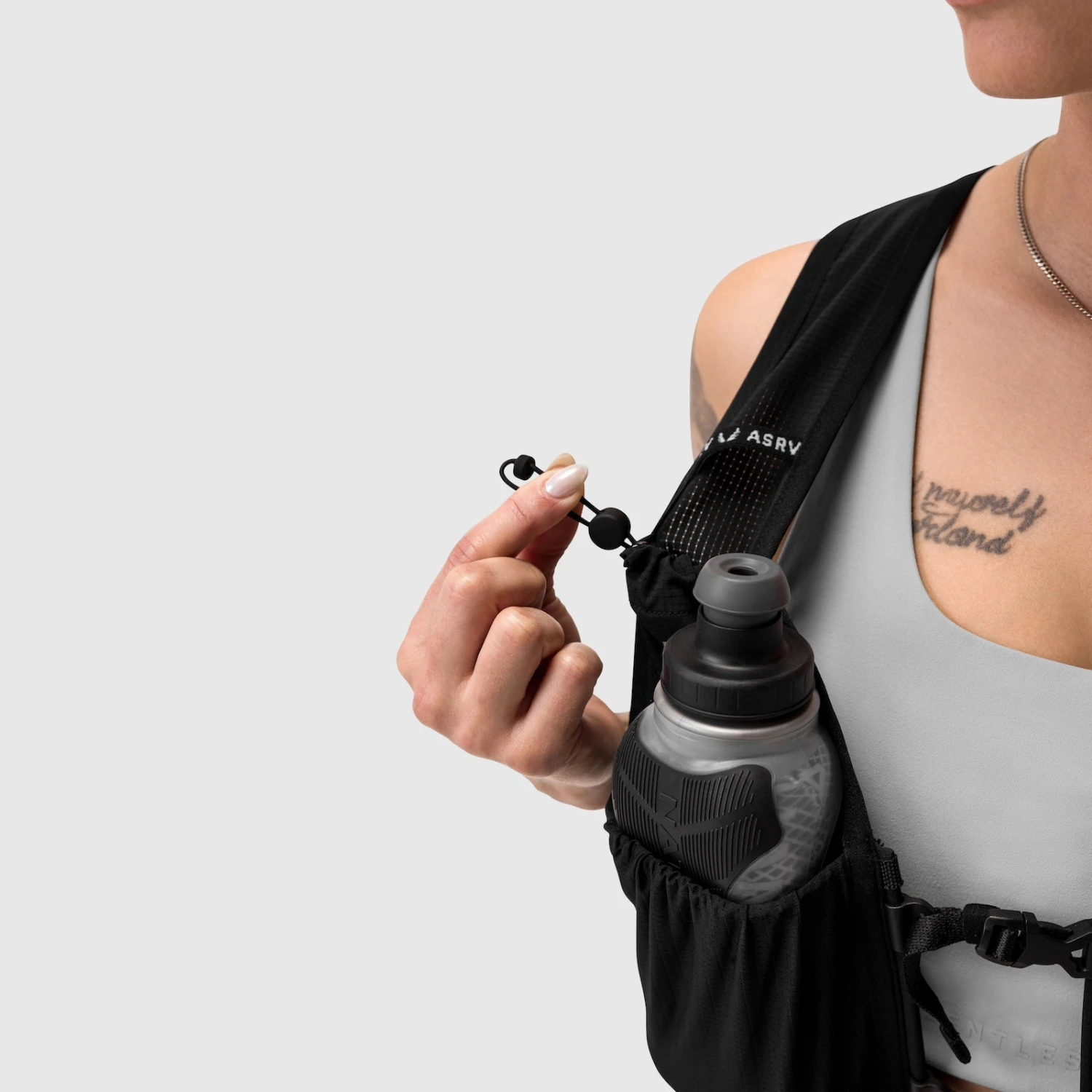 A performance-engineered running vest built for endurance training and outdoor rec. Constructed from sweat-wicking mesh with a grid-patterned perforation layout for maximum breathability and rapid moisture management. Designed with dual front hydration bottle slots, two external gel pockets, and an extra-secure zip pocket integrated into the pack. Adjustable chest and waist straps create a locked-in, bounce-free fit. Reflective heat-pressed ventilation holes along the spine enhance airflow and visibility in low-light conditions.