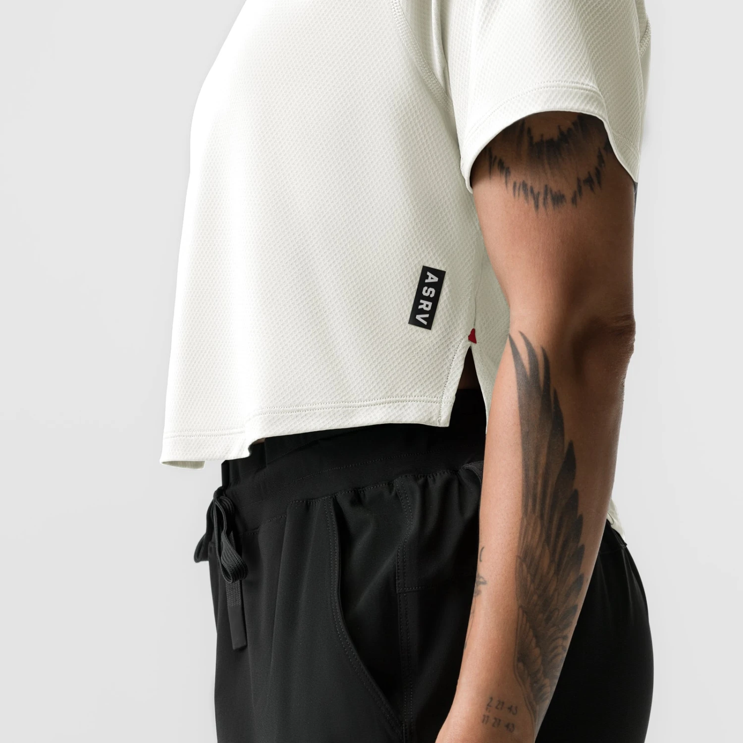 Lightweight mid-crop training tee designed with a curved hem. Made from AeroSilver®, our next generation of silver-infused performance fabric, offers enhanced durability and fiber strength to withstand intense training sessions. The tee features side splits with reinforced tack seams for added flexibility, while reflective logo details provide increased visibility during low-light workouts.